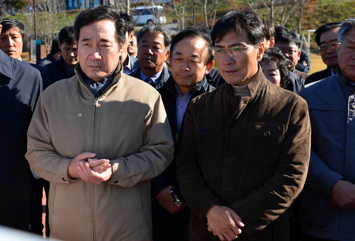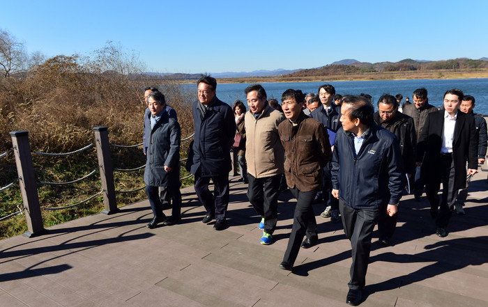 | ▲부여 백제보 주변을 둘러보는 안희정 충남지사(오른쪽 두번째),이낙연 국무총리(세번째) ,정진석 국회의원(네번째) <충남도청 제공> |