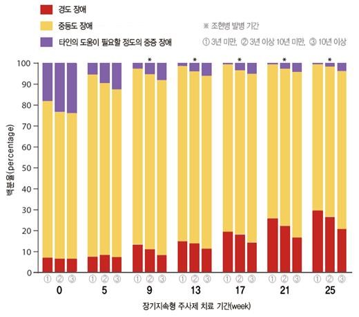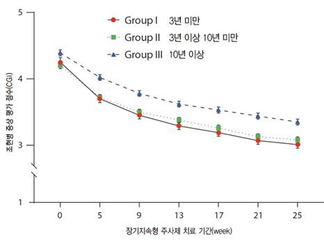 우선 환자 그룹을 조현병이 발생한 기간에 따라 ‘3년 미만(240명)’, ‘3년 이상 10년 미만(442명)’, ‘10년 이상(484명)’의 세 그룹으로 분류하고, 각 그룹별로 장기지속형 주사제를 통해 증상이 얼마나 호전됐는지 치료 효과를 비교했다.