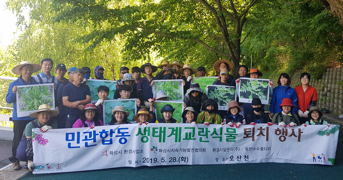 활동에는 화성시 수질관리과, 화성시지속가능발전협의회, 동탄수수꽃다리, 환경시설관리 관계자 등 35명이 참여해 오산동 967-1637번지부터 동탄순환대로까지 약1.2km 구간에 있는 생태계교란식물인 단풍잎돼지풀, 가시박 등을 뿌리째 뽑아 제거했다.