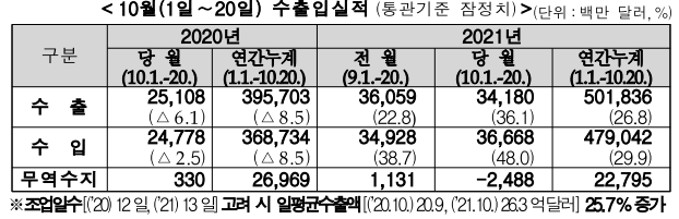한편 올 들어 이달 20일까지 누적 수출액은 5018억3600만 달러, 누적 수입액은 4790억4200만 달러를 기록했다.