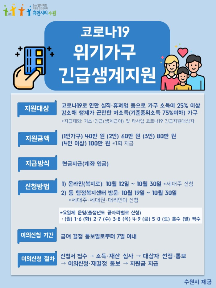 [로컬세계 고용주 기자]경기 수원시는 오는 12일부터 '긴급생계지원금' 신청·접수를 시작한다고 7일 밝혔다.