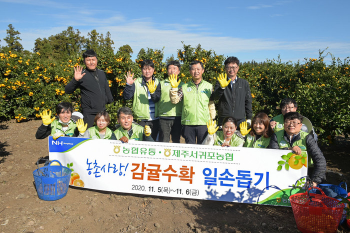 농식품 전문매장 농협 하나로마트를 운영하고 있는 농협유통(대표이사 정연태) 임직원 10여 명은 입동을 앞둔 5일, 1박 2일 일정으로 제주도 서귀포농협에 방문하여 감귤 수확 등 일손 돕기에 나섰다.