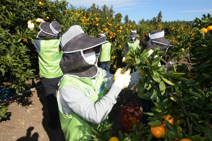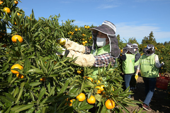 | ▲5일 농협유통 정연태 대표이사 등 임직원 10여 명이 제주도 서귀포농협에서 감귤 수확 등 산지 농가 일손 돕기를 하고 있다.(농협유통 제공) |