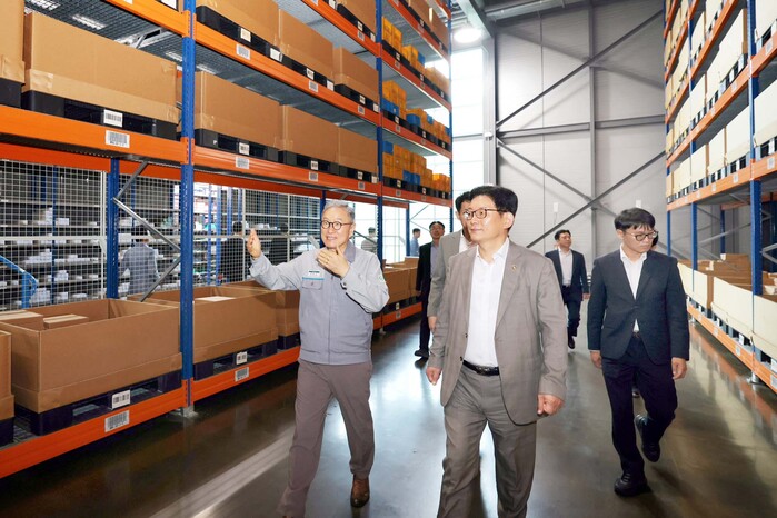 ▲ 고광효 관세청장이 9일 대구 달성군에 소재한 대구텍(유)를 방문하여 생산 현장 및 물류센터를 살펴보고 있다 |
