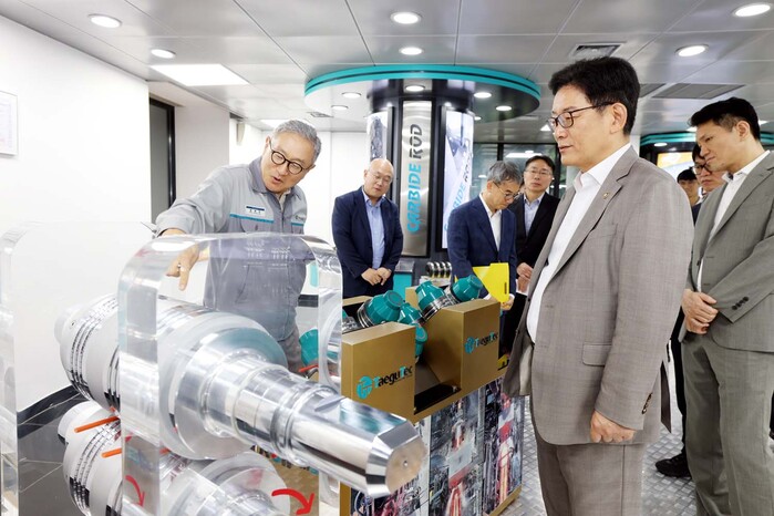 ▲고광효 관세청장(오른쪽)이 9일 대구 달성군에 소재한 대구텍(유)를 방문하여 생산 현장 및 물류센터를 살펴보고 있다 |