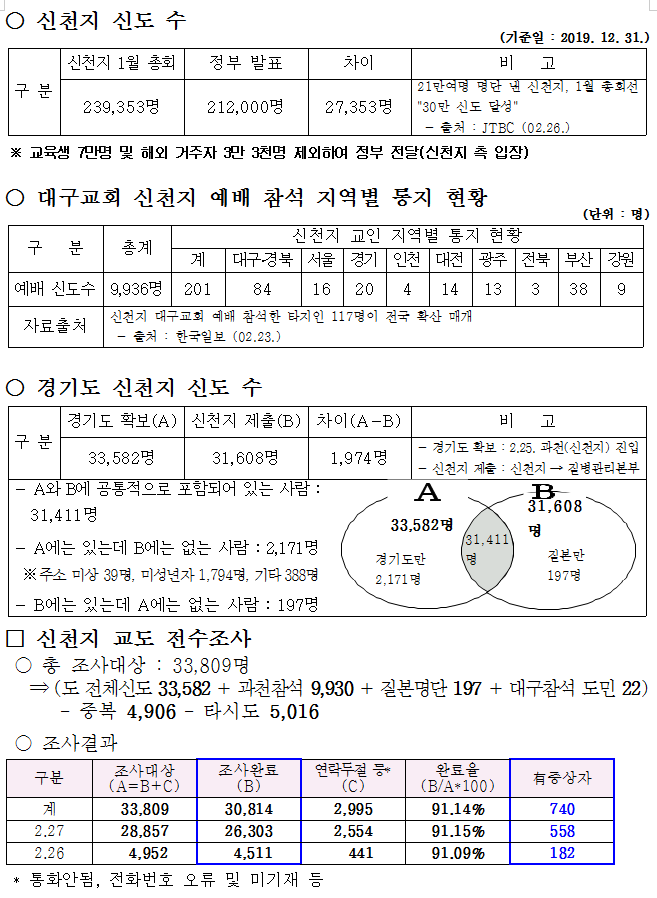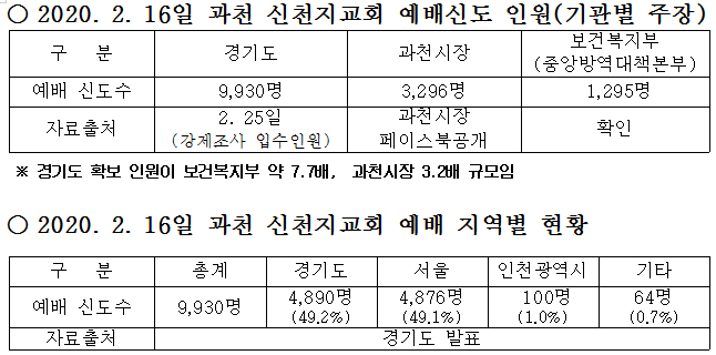 특히 질본을 통해 대구 방문자로 알려진 신도는 20명이었지만, 경기도의 강제조사 결과 확보한 대구 방문자는 22명으로 질본에서 받은 20명과는 전혀 다른 사람들이었다.