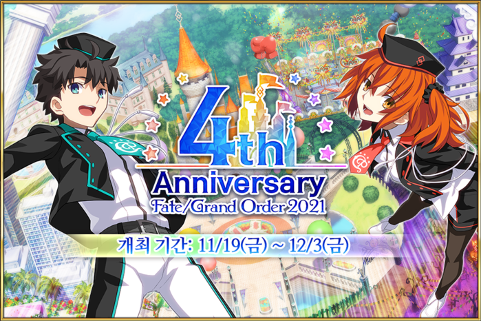 넷마블은 4주년 기념 특별 캠페인으로, 7일 연속 게임에 접속하면 '호부' 10장을 비롯한 호화로운 보상을, 12월 3일까지 메인 시나리오 퀘스트 미션을 완료하면 성정석 30개를 포함한 다채로운 보상을 제공한다. '페이트/그랜드 오더'를 시작한 이에게는 '스타트 대시 로그인 보너스' 7일차 보상을 2배 증량해서 지급한다. 이외에도 10월 1일부터 11월 19일 업데이트 전까지 게임에 접속한 이력이 없는 이용자가 '페이트/그랜드 오더'를 다시 시작하면 풍성한 혜택을 제공한다.