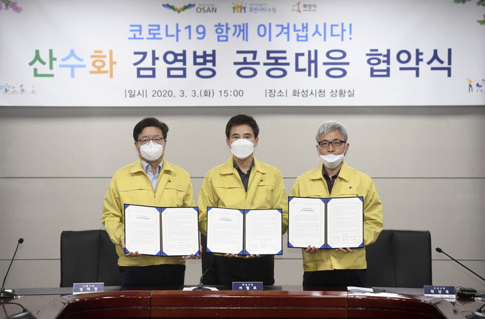 이에 화성시청 상황실에서 열린 협약식에서 곽상욱 오산시장과 염태영 수원시장, 서철모 화성시장은 코로나19 선제적 대응과 위기 극복을 위해 힘을 모으기로 했다.