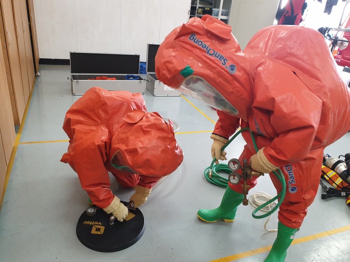 이번 훈련은 ▲화생방 물질 종류·특성 및 취급요령 ▲화학물질 사고대응시스템 활용법 ▲화생방테러 사고대응절차 등 안전사고 방지를 위한 이론교육을 시작으로, ▲화학보호복 및 방사능보호복 착용훈련 ▲가상 시나리오를 활용한 화생방테러 대응훈련 ▲ 탱크로리 차량 전복 및 화학물질 누출 가정 구조훈련 ▲현장안전관리 등 실전을 가정한 구조기법으로 구성했다.