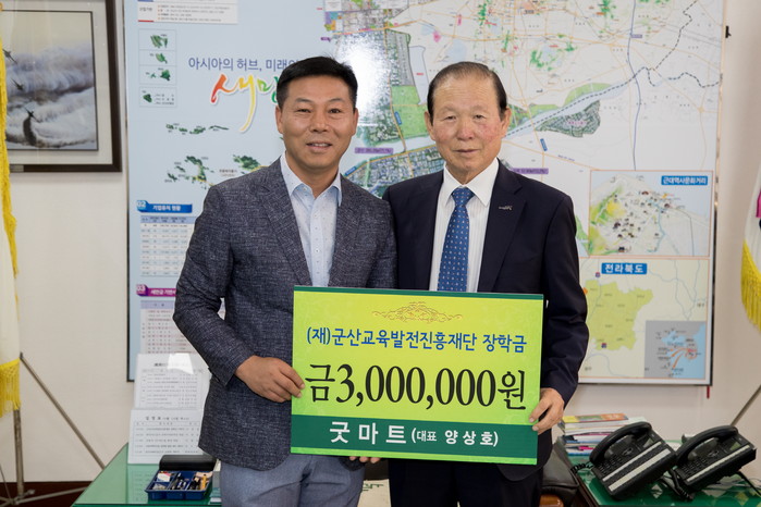 [로컬세계 양해수 기자]전북 군산시 경암동에서 굿마트를 운영하는 양상호 대표(48세)가 14일 지역 인재양성을 위해 사용해 달라며 지난해에 이어 올해도 장학금 300만원을 군산교육발전진흥재단(이사장 문동신 시장)에 기탁했다.
