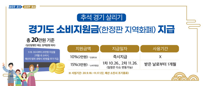 한편 소비지원금(한정판 지역화폐)은 20만원 충전으로 기존 10% 인센티브와 함께 15%에 해당하는 추가 소비지원금 등 역대 최고 수준의 혜택을 제공하는 경기도의 경제방역정책이다. 소비지원금(한정판 지역화폐) 혜택을 받으려면 지난 18일 이후 사용액 기준으로 늦어도 오는 11월 17일까지 최소 20만원을 소비해야 하는데 1000억원 규모의 예산 소진 시까지 경기지역화폐카드 또는 모바일 지역화폐를 소지한 모든 경기지역화폐 이용자를 대상으로 ‘선착순’ 지급한다.