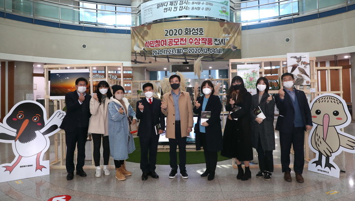 ▲ 2020 화성호 시민참여 공모전 시청 로비 전시 앞에서 서철모 화성시장과 수상자들이 기념촬영을 하고 있다. 화성시 제공 |