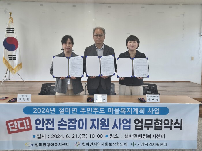 [로컬세계 부산=맹화찬 기자]부산 기장군 철마면행정복지센터는 지난 21일 철마면지역사회보장협의체, 기장지역자활센터와 함께 ‘단디! 안전 손잡이 지원 사업’추진을 위한 업무협약을 체결했다고 24일 밝혔다.