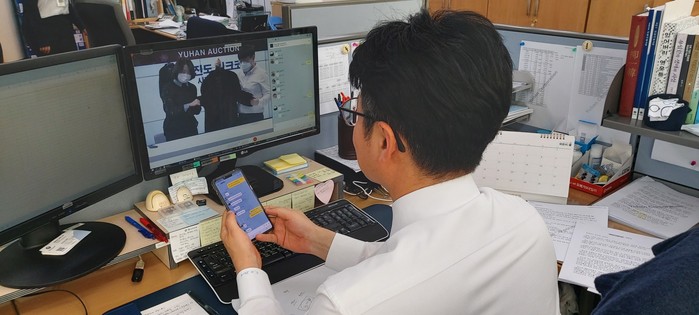 | ▲유한양행의 한 직원이 온라인 경매에 참여하고 있다. |