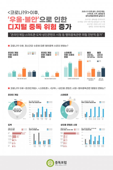 중독포럼은 이런 결과가 언택트 사회로 전환되면서 우울, 불안 등이 악화되고, 디지털미디어의 과도한 사용으로 이어져, 중독 등 정신행동 건강 악화로 귀결될 수 있음을 보여주고 있다고 설명했다.