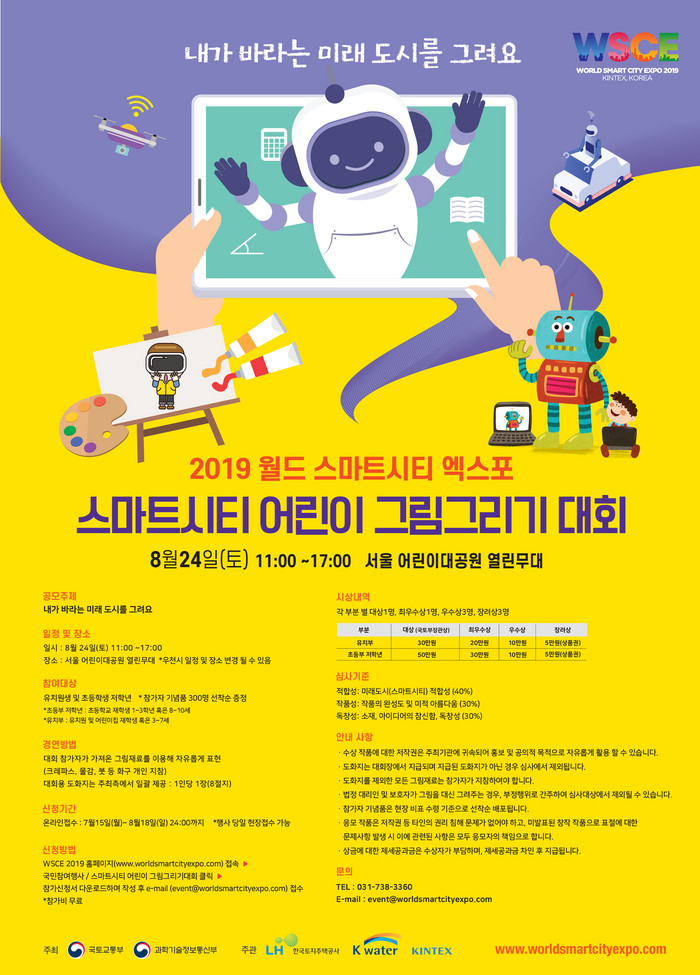 한국수자원공사는 2019 월드 스마트시티 엑스포를 기념하기 위해 오는 24일 오전 11시 서울어린이대공원에서 ‘스마트시티 어린이 그림그리기 대회’를 개최한다고 12일 밝혔다.