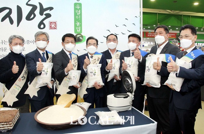 | ▲농협은 18일 고품질 브랜드 쌀 '순수지향'을 출시하고 농협유통 양재점에서 기념행사를 실시했다. 맨 왼쪽 농협유통 정연태 대표이사, 왼쪽에서 네번째(농협경제지주 장철훈 농업경제대표이사), 왼쪽에서 여섯번째(국회 농해수위 서삼석 의원), 오른쪽에서 다섯번째(농협중앙회 이성희 회장) 맨 오른쪽 (농협양곡 나병만 대표이사) |