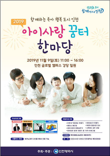 [로컬세계 이민섭 기자]인천시는 오는 9일 인천글로벌캠퍼스 강당에서 시민 참여형 축제 ‘2019년 아이사랑 꿈터 한마당’을 개최한다고 밝혔다.