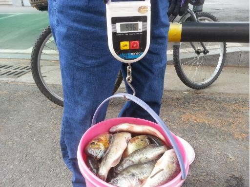 | ▲블루길, 배스 등 외래어종의 무게를 재고 있다. |
