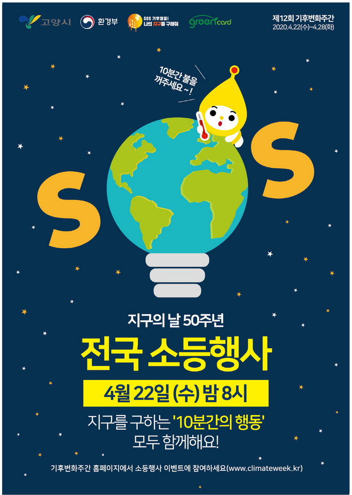 경기 고양시(시장 이재준)는 50주년 지구의 날인 22일, 수요일 저녁 8시부터 10분간 소등행사를 실시한다고 21일 밝혔다.