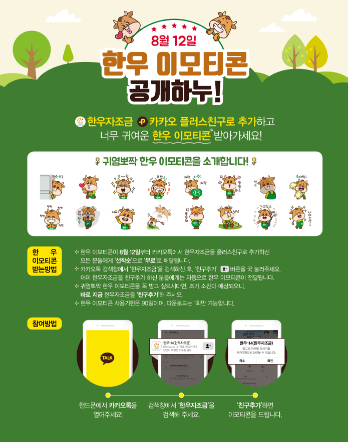 특히 ‘뭐한우?’, ‘어떡한우’, ‘가고있소’ 등 ‘한우’와 ‘소’를 연계한 재치 있는 멘트를 더한 것이 특징이다. 이모티콘 사용 기간은 90일이며, 총 4만7000명에게 지급할 계획이다. 이모티콘이 소진되면 이벤트는 조기 자동으로 종료된다.