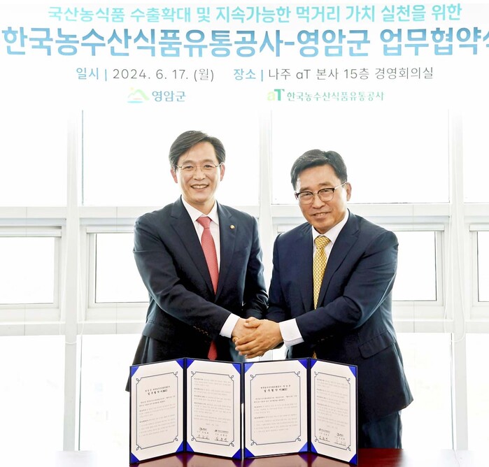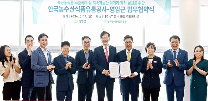 한국농수산식품유통공사(사장 김춘진)는 17일 나주 본사에서 영암군(군수 우승희)과 함께 K-푸드 수출 확대와 저탄소 식생활 확산을 위한 업무협약을 체결했다.