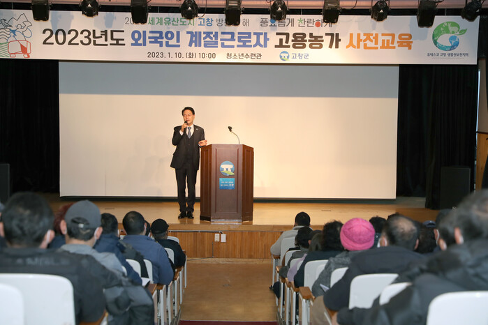 [로컬세계=김경락 기자]전북 고창군이 10일 고창군 청소년수련관에서 2023년 외국인 계절근로자 고용농가를 대상으로 사전교육을 실시했다.