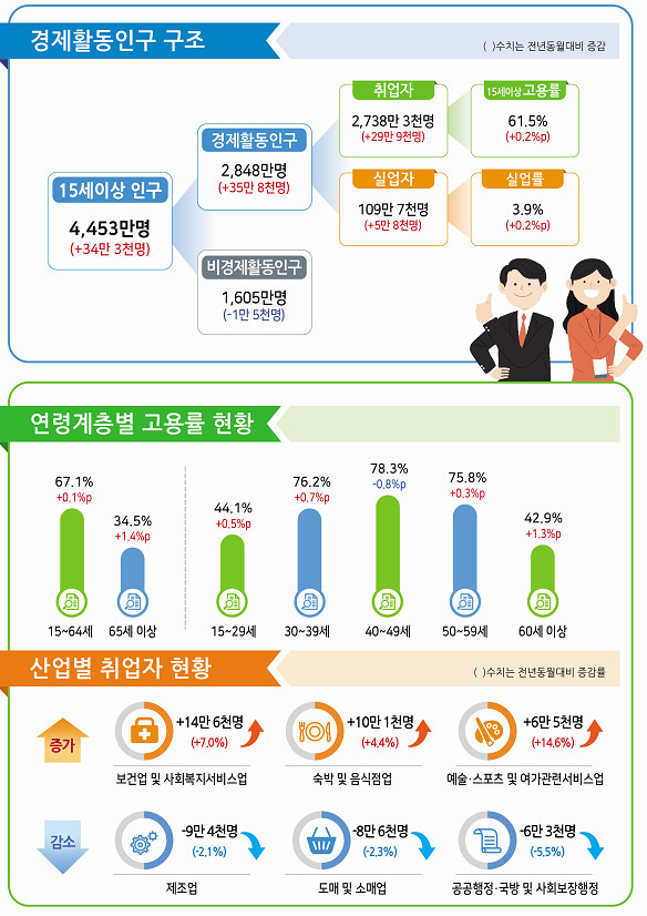 반면 제조업(-9만4000명, -2.1%), 도매 및 소매업(-8만6000명, -2.3%), 공공행정·국방 및 사회보장행정(-6만3000명, -5.5%) 등에서 줄었다.
