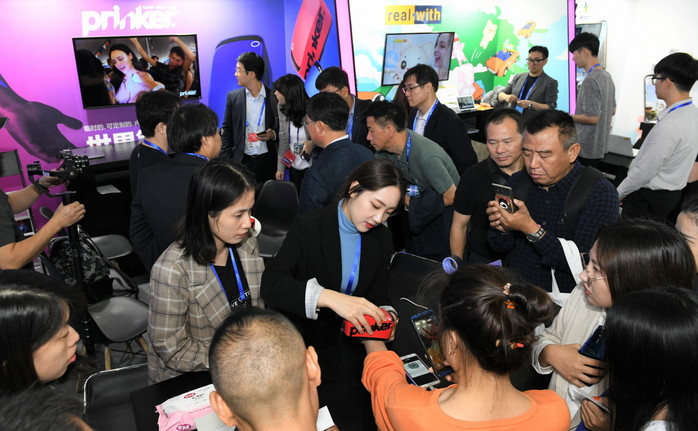 ▲‘제 21회 중국 하이테크페어(CHTF)’ 한국공동관에서 스케치온 주식회사가 즉시 프린팅이 가능한 1회용 타투 솔루션 시연하고 있다.(한국콘텐츠진흥원 제공) |