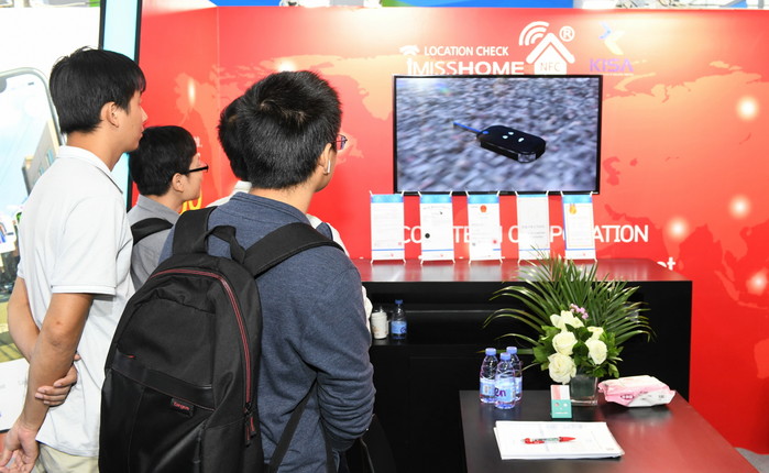 ▲‘제 21회 중국 하이테크페어(CHTF)’ 한국공동관에서 엘코어텍이 NFC태그를 활용한 위치확인 서비스 동영상 시연하고 있다. |
