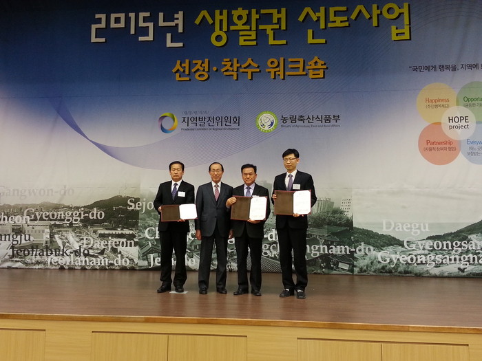 | ▲10일 정부세종청사 행정지원센터 국제회의장에서 열린 ‘2015년 지역행복생활권 선도사업 선정·착수 워크숍’에서 전북 정읍시, 고창군, 부안군 관계자들이 인증서를 들고 기념촬영을 하고 있다. |