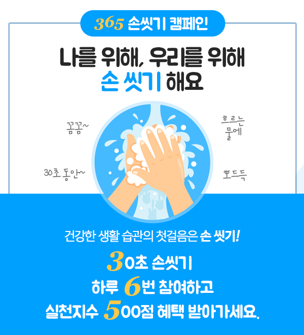 365 손씻기 캠페인은 ‘30초 동안 손씻기를 하루 6번 이상 하면 365mc에서 실천지수 500점을 증정한다’는 의미다. 하루 6번 손씻기에는 아침 세안, 저녁 세안, 화장실 이용 전후를 제외한 횟수로 손 위생에 평소보다 더욱더 신경 쓰자는 취지다.