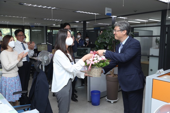 | ▲한국수자원공사가 코로나19로 경제적 어려움을 겪고 있는 화훼 농가를 지원하기 위해 진행하고 있는 ‘플라워 버킷 챌린지’를 통해 박재현 한국수자원공사 사장(오른쪽)이 7일 본사에서 직원에게 꽃바구니를 전달하고 있다.(한국수자원공사 제공) |