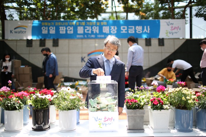 | ▲ 박재현 한국수자원공사 사장이 대전시 대덕구 한국수자원공사 본사 다목적홀에서 대전 지역 5개 화훼농가가 참여하는 ‘일일 팝업 플라워 매장 모금행사’에 참여하고 있다. |
