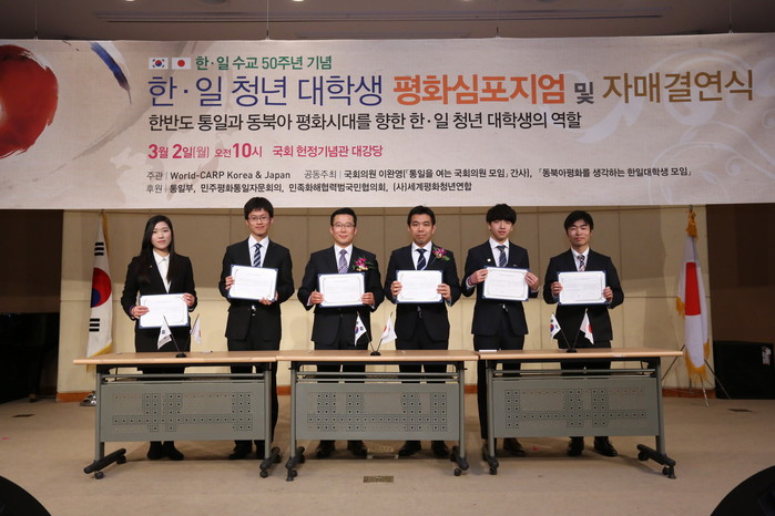 [로컬세계 로컬세계] 한·일 수교 50주년을 맞아 2일 국회 헌정기념관에서 한국과 일본 대학생들은 새로운 한일 관계를 출발을 약속하는 자매결연식과 더불어 ‘한반도 통일과 동북아 평화시대를 향한 한·일 청년대학생의 역할’이란 주제로 ‘평화심포지엄’을 가졌다.