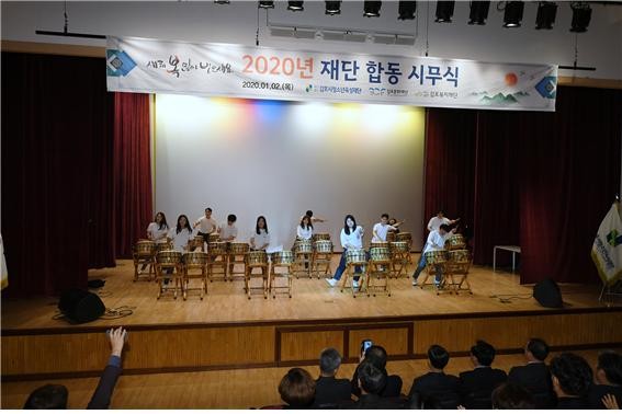 이날 시무식은 김포시청소년육성재단 지도사들의 ‘모둠북공연’을 시작으로 김포문화재단의 ‘색소폰공연’과 ‘성악공연’이 펼쳐져 희망찬 새해의 시작을 알렸다.