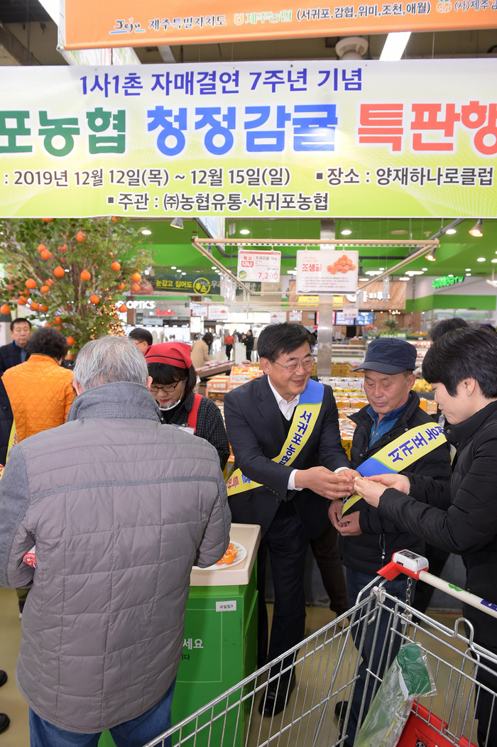 12일 서울 서초구 하나로마트 양재점에서는 자매결연 마을인 제주 서귀포 농협에서 생산한 감귤 할인 행사를 시작했다. 서귀포농협 현영택 조합장이 고객들에게 제주 감귤을 설명하고 있다.