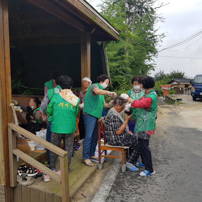이날 새마을 부녀회원들은 화전1리, 도원2리 마을을 다니며 농사일에 바쁘거나 혼자서 염색을 하지 못하는 어르신 40명을 대상으로 머리염색 자원봉사를 했다.