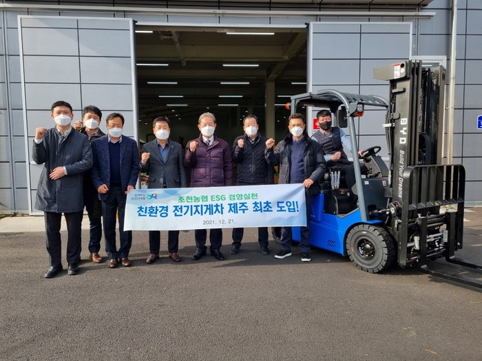 [로컬세계 이명호 기자]농협(회장 이성희) 경제지주 계열사인 NH농협무역이 21일 제주도 조천농협 농산물산지유통센터에서 BYD 친환경 전기지게차를 공급하고 기념행사를 개최했다고 밝혔다.