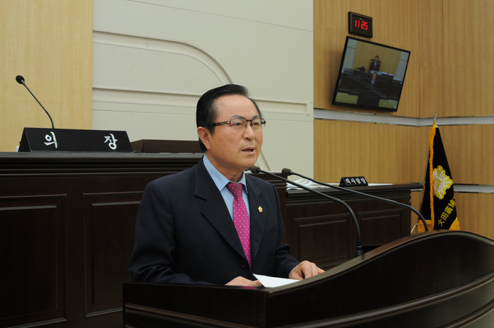 ▲20일 대전동구의회에서 원용석 의원이 구정질문을 통해 6.25참전유공자 기념비가 있는 가양쌈지공원 관리방안과 민방위 비상급수시설의 유지 및 관리 대책을 묻고 있다. |