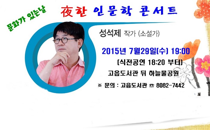 [로컬세계 이혁중 기자] 경기 양주시립도서관은 오는 29일 문화의 날을 맞아 <투명인간> 등의 소설로 유명한 성석제 작가를 초청 고읍도서관 뒤 하늘물공원에서 ‘夜한 인문학 콘서트’를 개최한다.