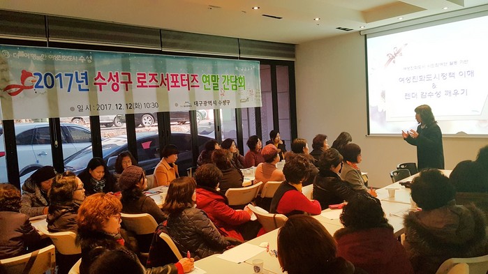수성구 로즈서포터즈단은 수성구가 추진하는 여성친화도시 사업 전반에 대한 의견 제시와 정책 제안은 물론 생활 속 불편사항 모니터링과 여성의 권익향상을 위한 시민의식 변화를 주도하는 등 여성친화도시 발전에 핵심적인 역할을 수행하고 있다.