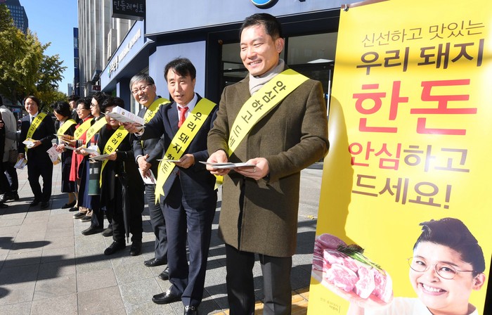 | ▲14일 서울 종로구에서 진행된 정부, 소비자, 생산자가 함께하는 한돈 안심 캠페인에서 하태식 위원장(오른쪽 두번째)이 시민들에게 홍보물을 나눠주고 있다 |