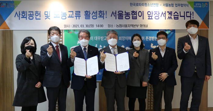 | ▲30일 농협 서울지역본부(본부장 이대엽, 왼쪽 4번째)와 (사)한국로타리청소년연합(이사장 장기윤, 왼쪽 3번째)는 사회공헌 및 도농교류 활성화를 위한 MOU를 체결했다./서울농협 제공 |