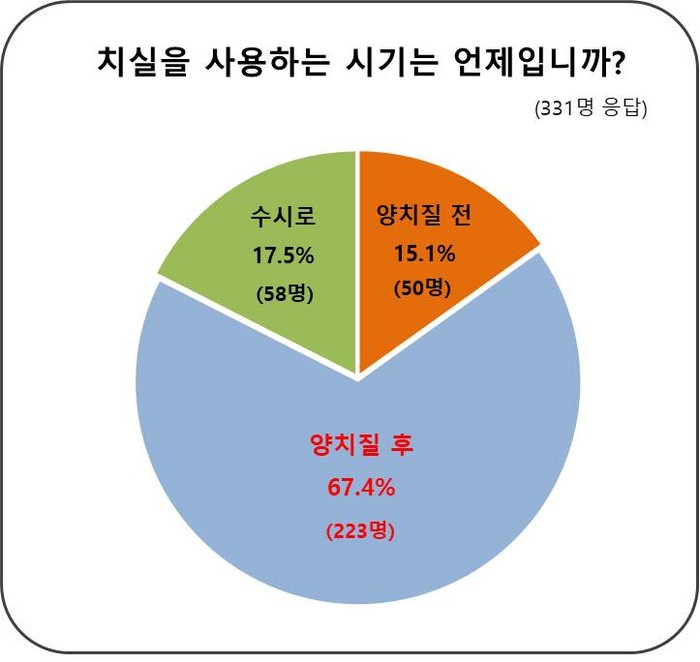 응답자의 67.4%가 양치질을 한 후 치실을 사용하는 반면 15.1%는 양치질 전에 치실을 사용하는 것으로 나타났다. 고광욱 파주 유디치과 대표원장은 “치실 사용은 칫솔질 전에 하는 것이 좋다”며 “그 이유는 치실 사용 후 칫솔질을 해야 치약 속의 충치 예방 성분인 불소가 치아 사이 공간에 골고루 적용될 수 있기 때문”이라고 말했다.