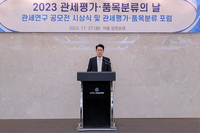 ▲ 27일 서울 삼정호텔에서 개최한 '2023년도 관세평가·품목분류의 날'에서 축사하는 한민 관세청 심사국장. |