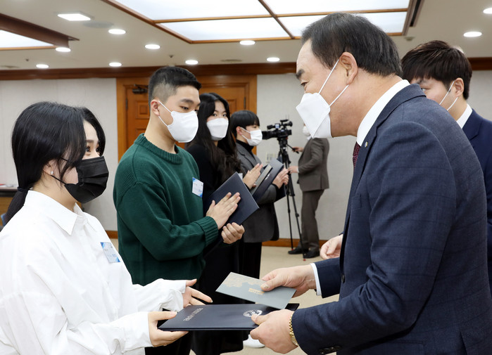 | ▲임준택 수협재단 이사장이 25일 장학증서 수여식에 참석한 장학생 대표에게 장학 증서를 전달하고 있다.(수협중앙회 제공) |