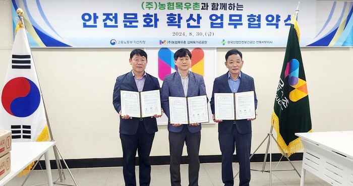 농협목우촌(대표이사 조재철)은 지난 8월 30일 전북 김제 육가공공장에서 고용노동부 익산지청, 한국산업안전보건공단 전북서부지사와「안전문화 확산 업무협약」을 체결했다고 3일 밝혔다.