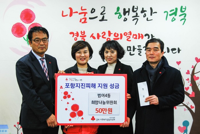 전기수 위원장은 “지진으로 어려움을 겪고 있는 포항시민들에게 조금이나 도움이 되고 싶어 회원들이 십시일반 모아 성금을 마련했다”면서 “하루빨 리 피해가 복구돼 안정을 찾길 바란다”고 전했다.
