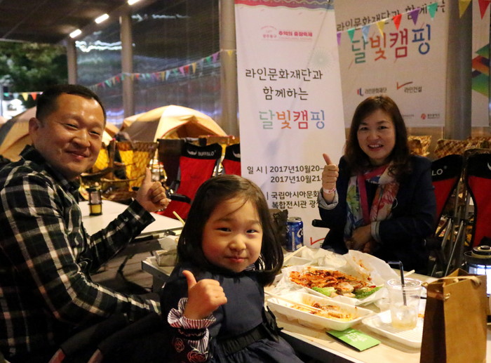 ▲20일, 광주에 위치한 국립아시아문화전당 일원에서 열린 제14회 추억의 충장축제 ‘라인문화재단과 함께하는 충장 달빛캠핑’ 행사장에서 한 어린이가 엄마, 아빠와 함께 캠핑을 즐기고 있다. |